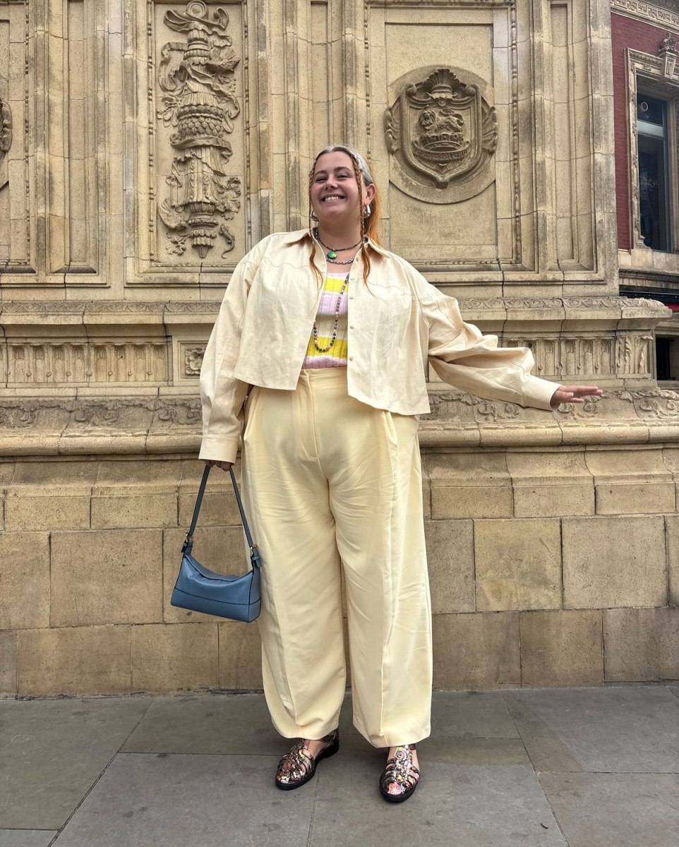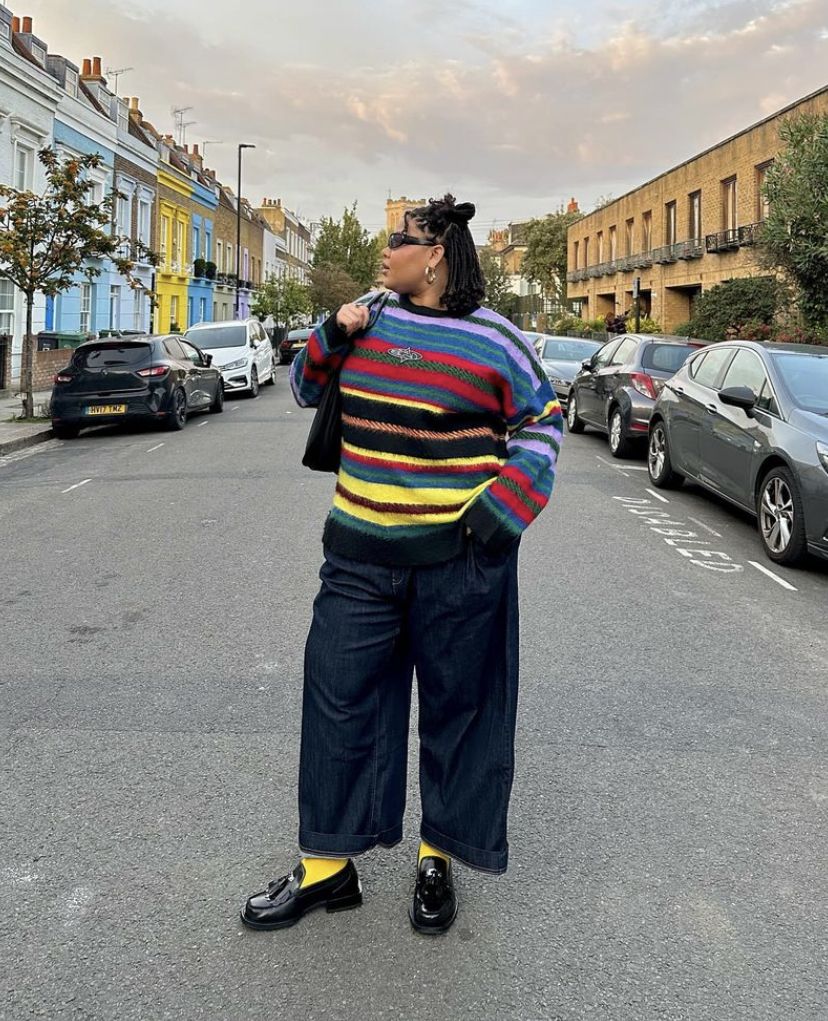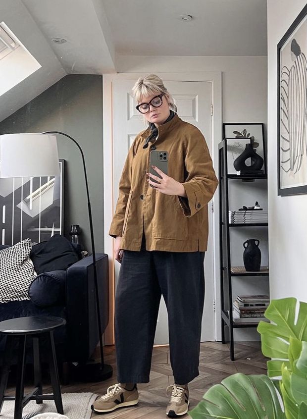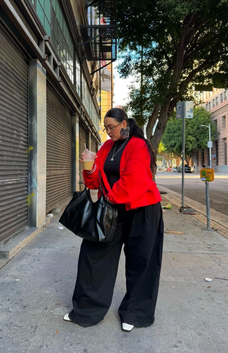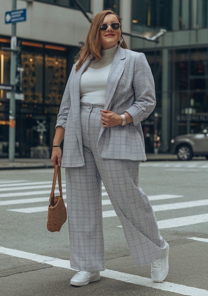 Многие пышки боятся привлекать внимание к щиколоткам, и я это понимаю. Но тут есть хитрость. Этот прием лучше всего работает с брюками, а не с юбками. Когда видна лишь небольшая цветная полоска между краем брючины и обувью, это выглядит как продуманная деталь, а не как ошибка.