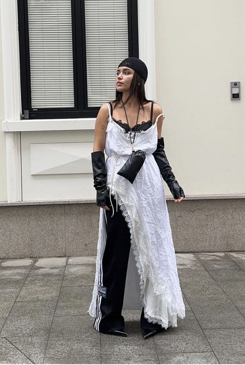 Главное правило — нижний слой (брюки) должен быть без лишних деталей, а верхний (платье или юбка) — из струящейся ткани.