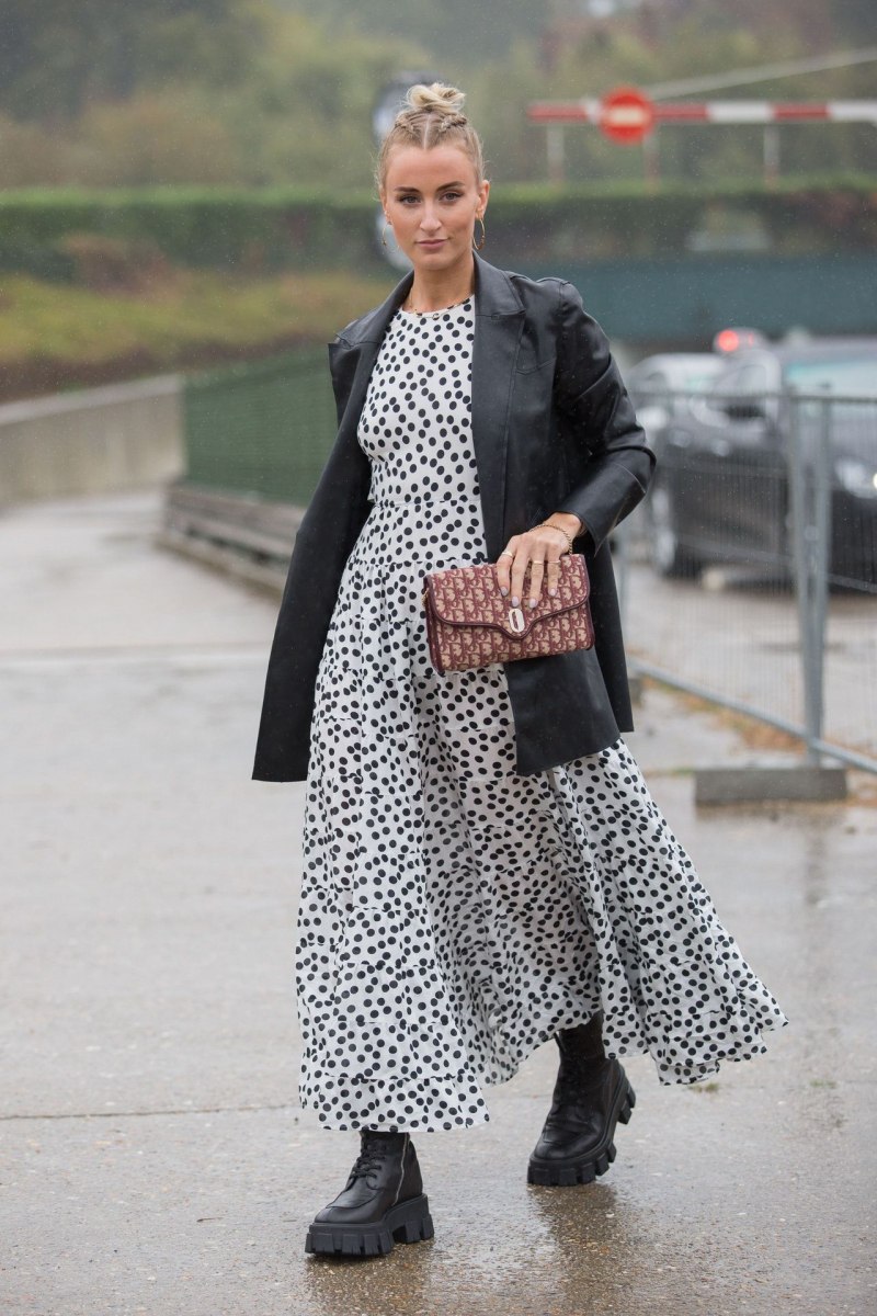 Например, берем женственное платье в горошек. Первое, что просится, — туфельки. А мы берем и надеваем на ноги грубые ботинки.